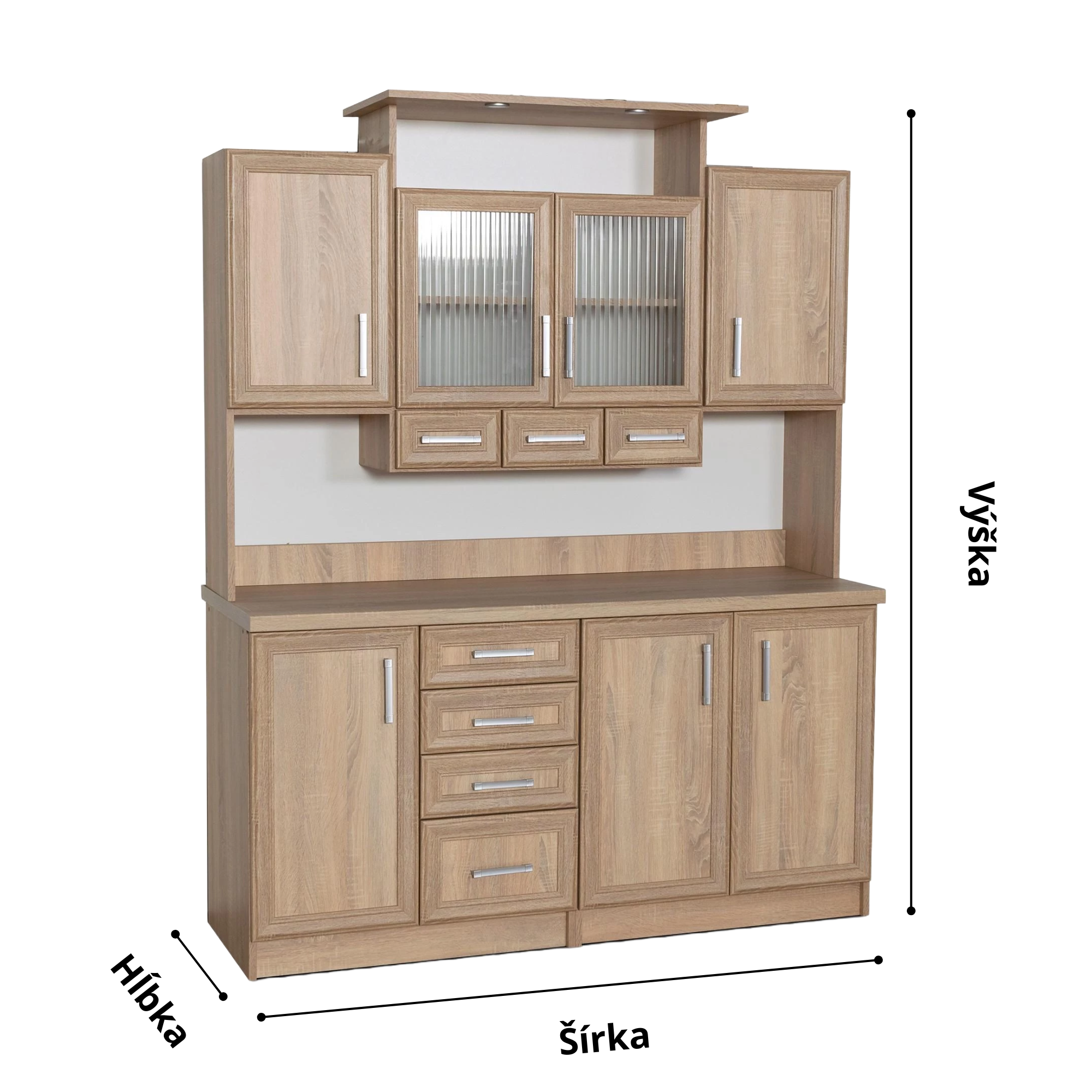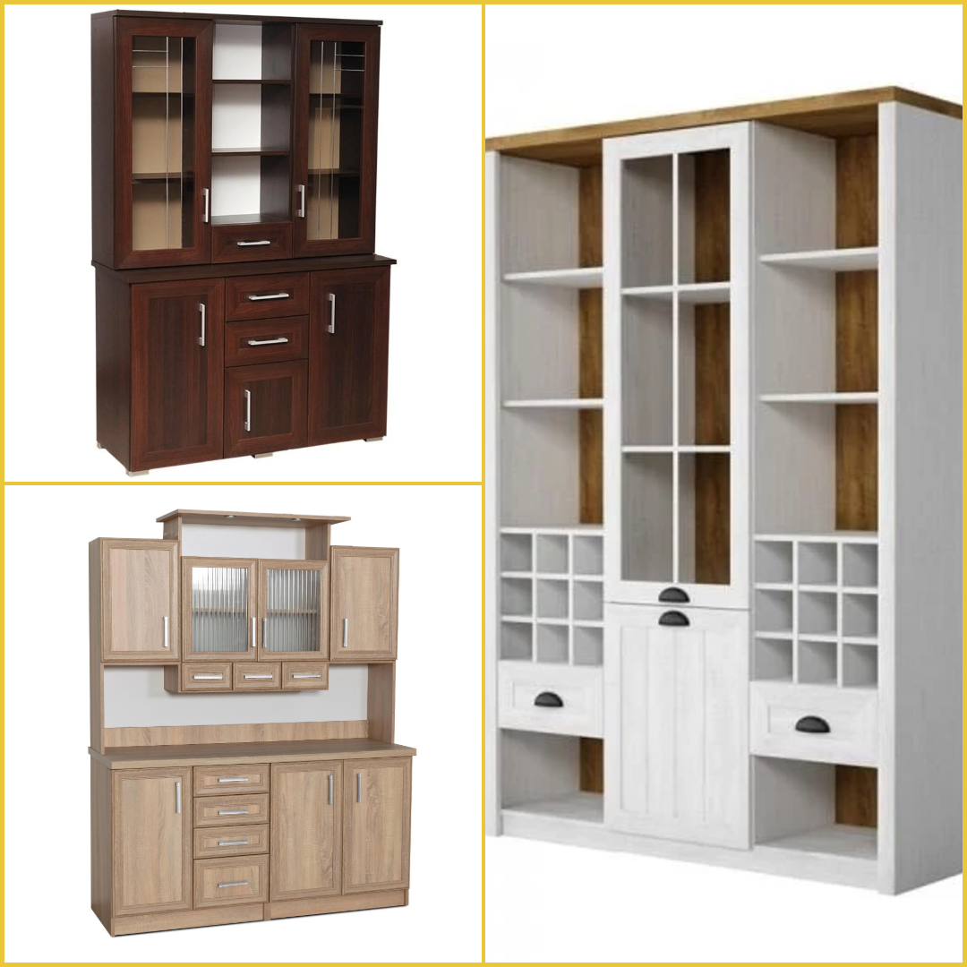 - Kredenc: Tradične je to vyšší, dvojdielny kus nábytku. Skladá sa zo spodnej, hlbšej skrinky (často s plnými dvierkami a zásuvkami) a horného, plytšieho nadstavca, ktorý býva presklený alebo otvorený. Medzi týmito časťami je často voľná odkladacia plocha. Je to multifunkčný kus nábytku, ktorý slúži ako hlavný úložný priestor v kuchyni.