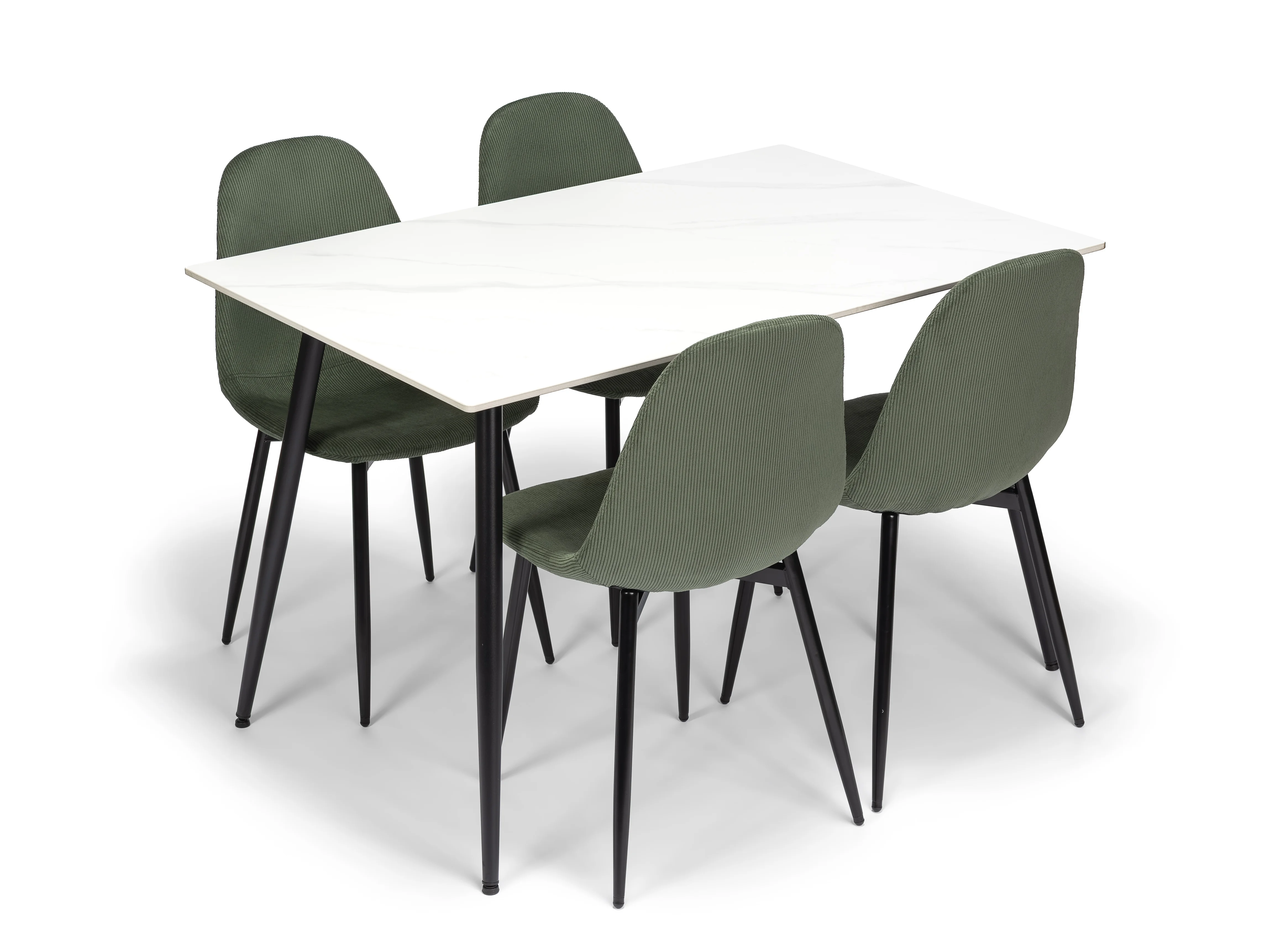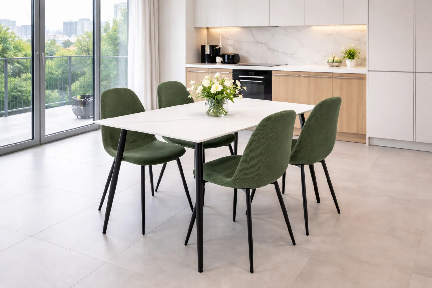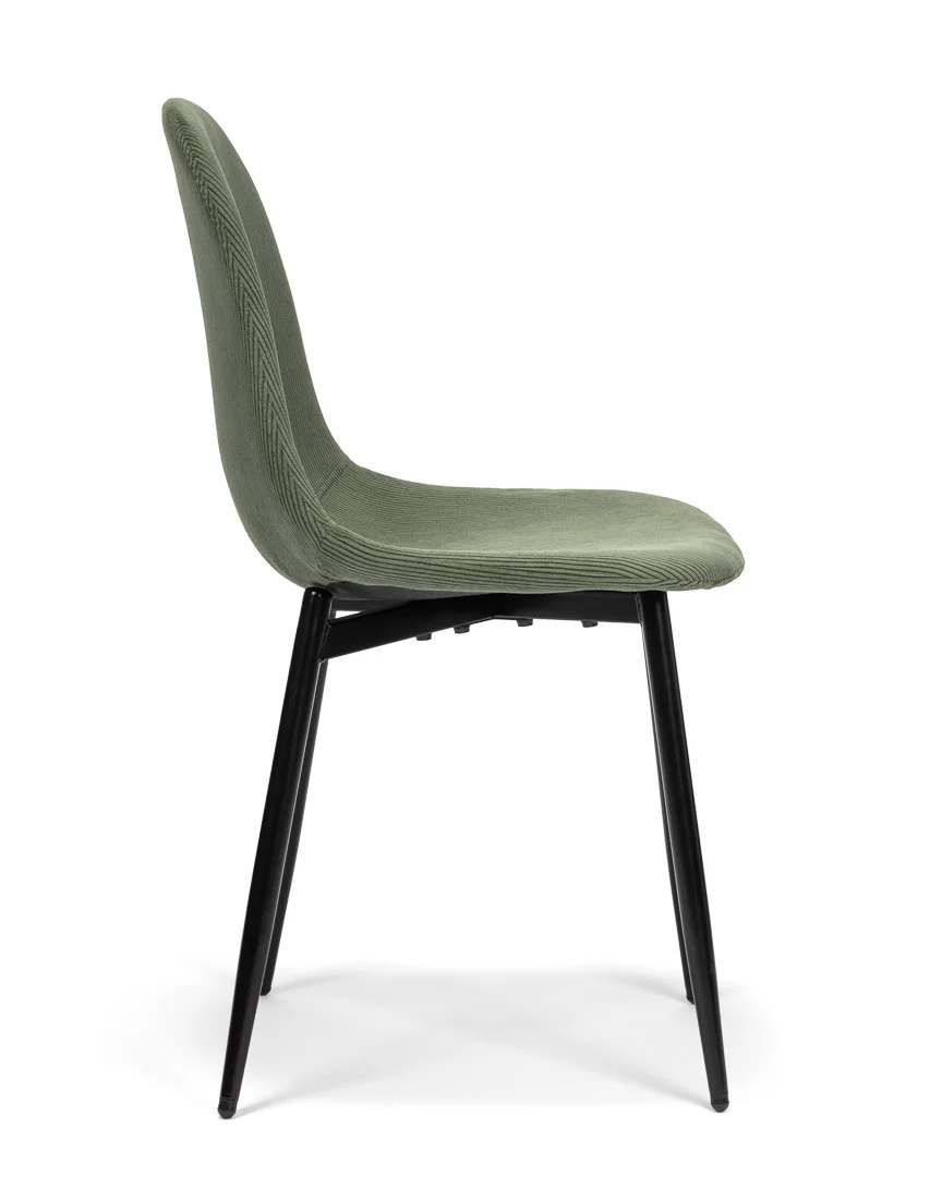 Židle v příjemném zeleném odstínu přinášejí do prostoru klid a harmonii. Jemná struktura látky působí elegantně, zatímco ergonomicky tvarované opěradlo zajišťuje komfort i při delším sezení – ať už u večeře, práce nebo víkendového posezení s přáteli.