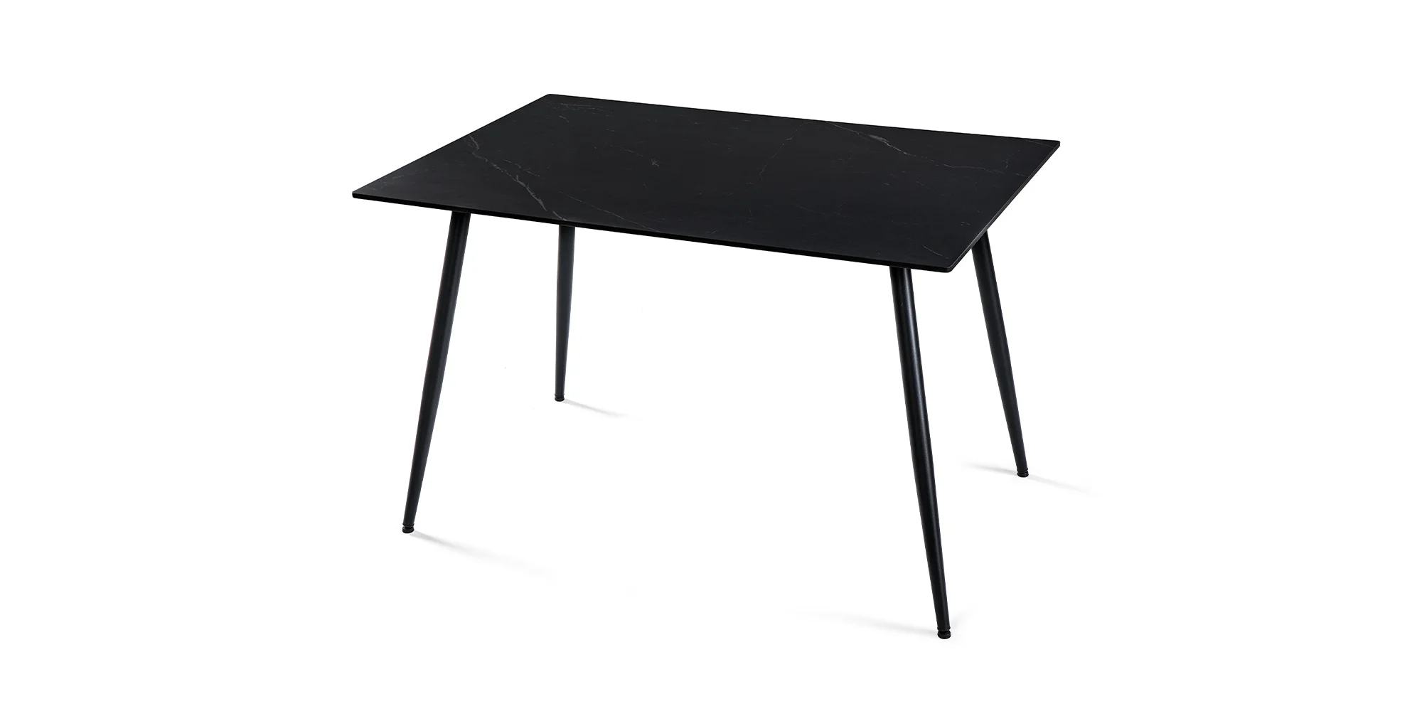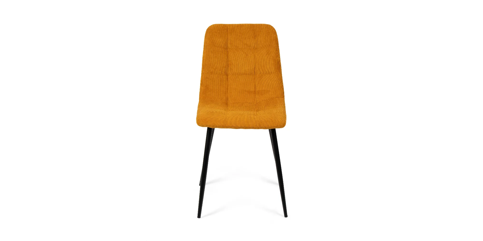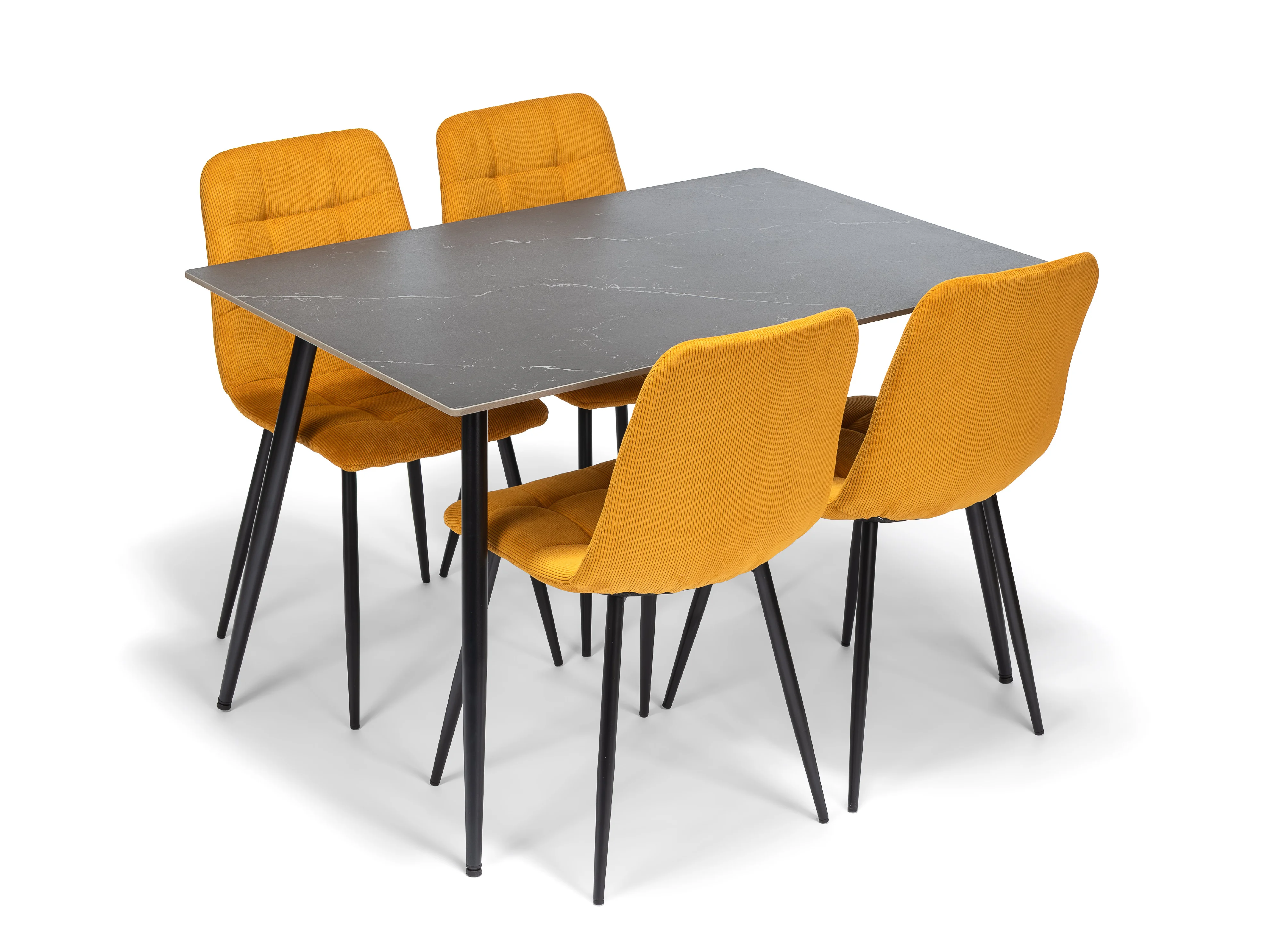 Minimalistická stolová deska s jemnou strukturou kamene působí klidně a sofistikovaně, zatímco čalouněné židle v teplém odstínu dodávají interiéru hloubku a charakter. Kontrast mezi tmavou konstrukcí a výrazným textilním prvkem vytváří vizuálně vyvážený celek, který zapadne do moderních i nadčasově laděných interiérů.