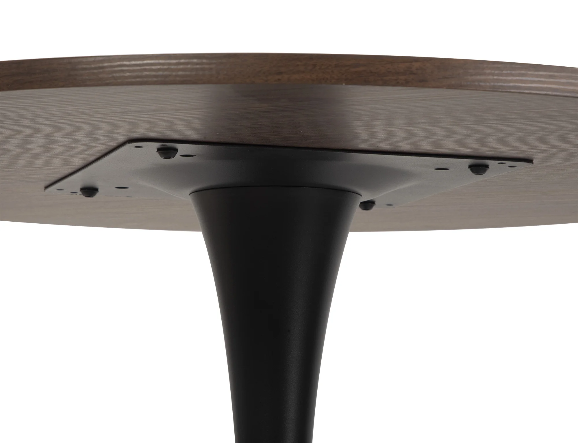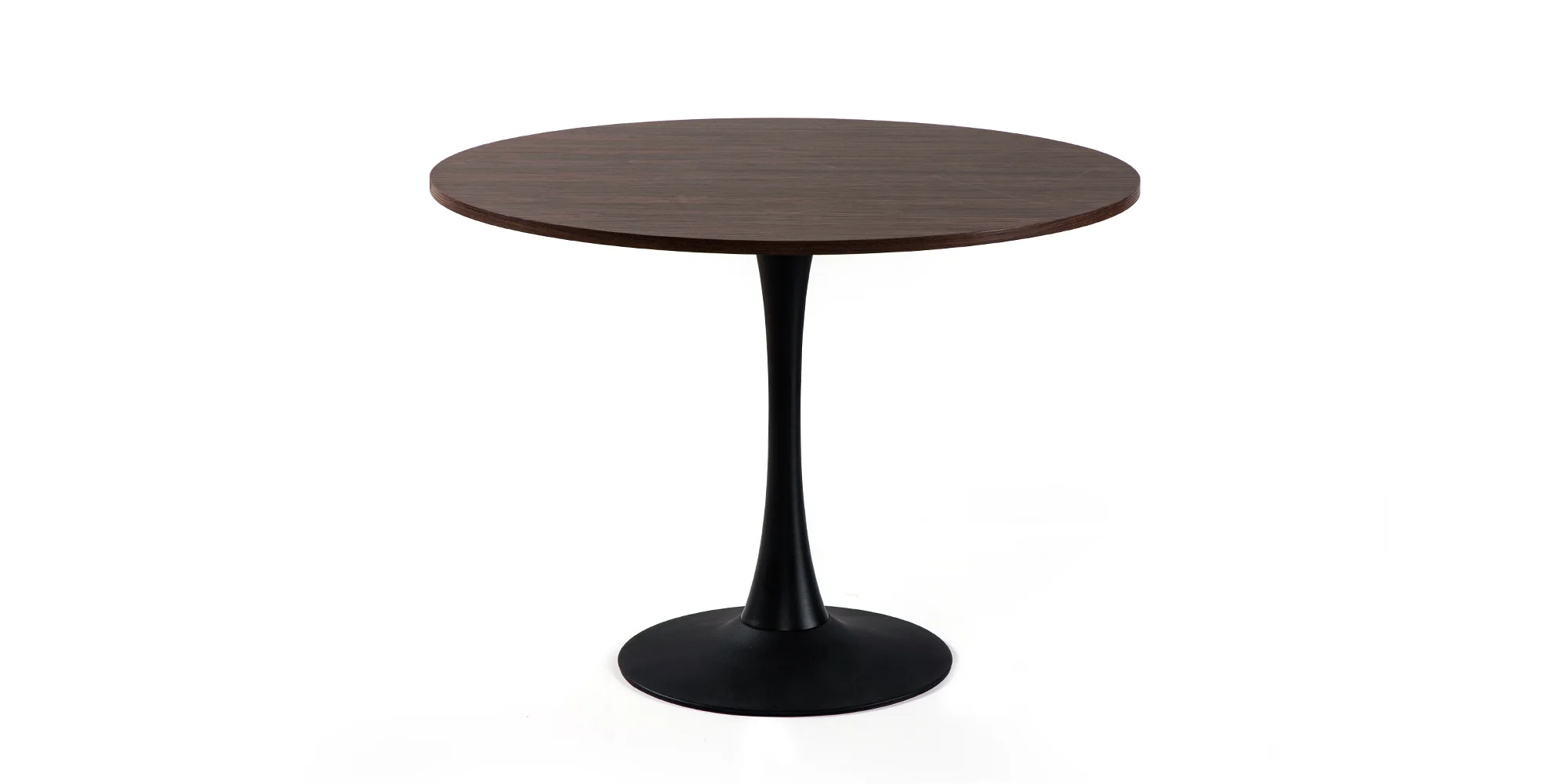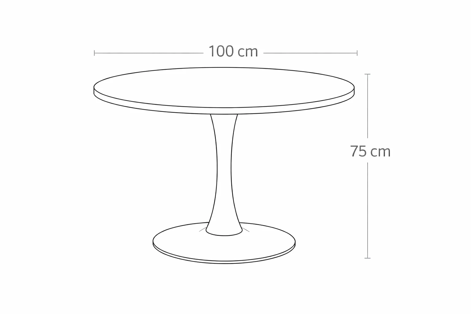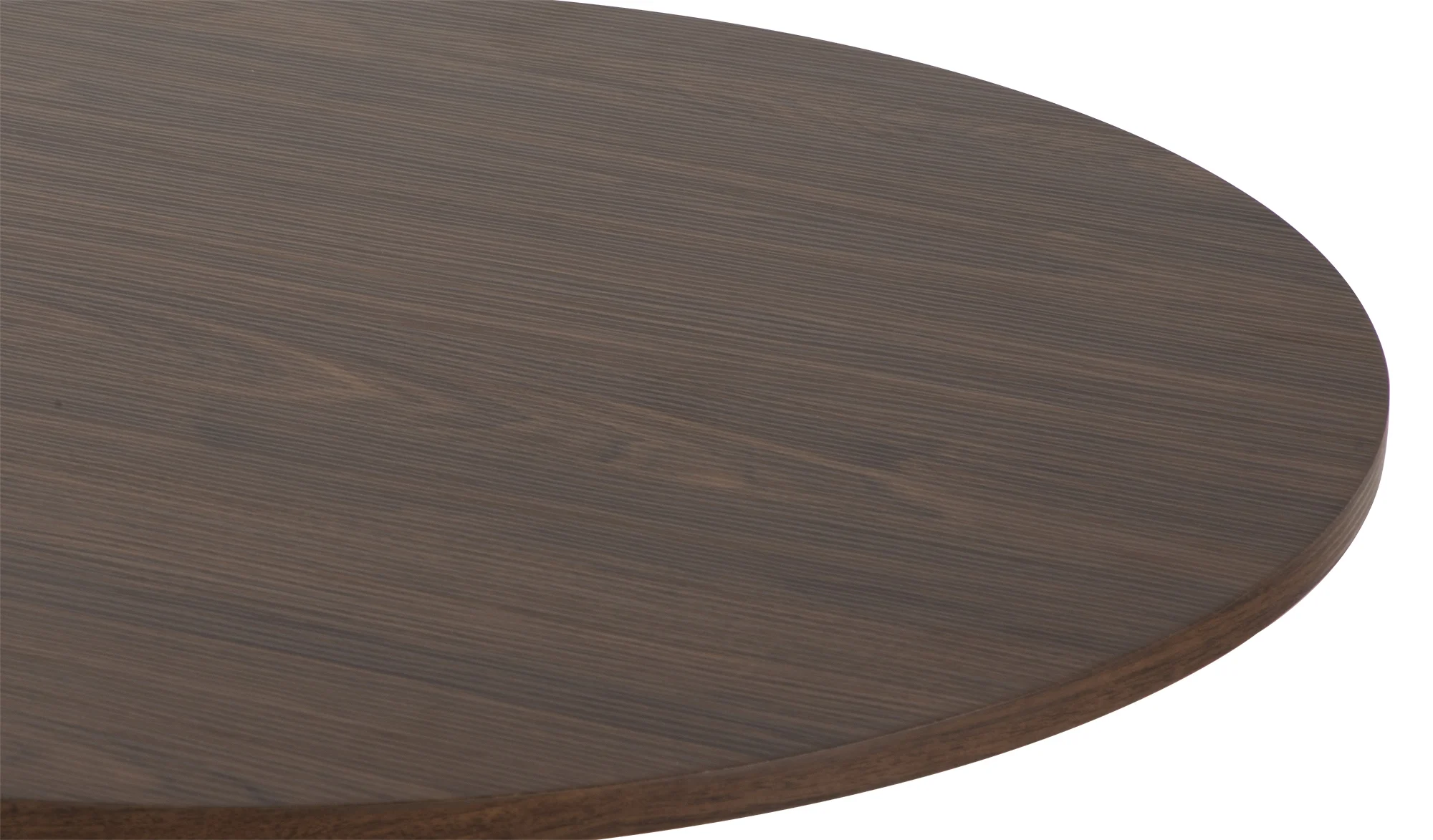 Kulatý stůl s výraznou dřevěnou kresbou přináší do interiéru přirozenost a eleganci. Jeho centrální podnož nejen skvěle vypadá, ale zároveň nabízí více prostoru a pohodlí pro každého u stolu.