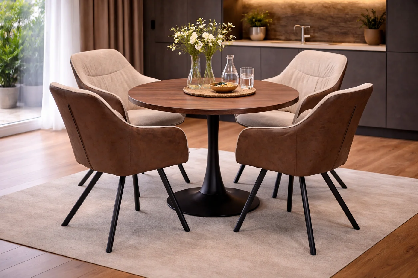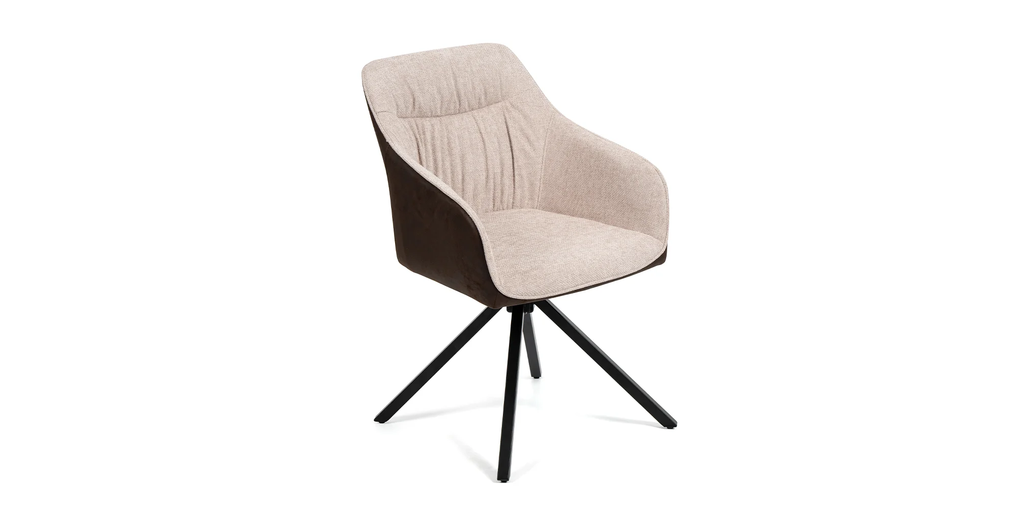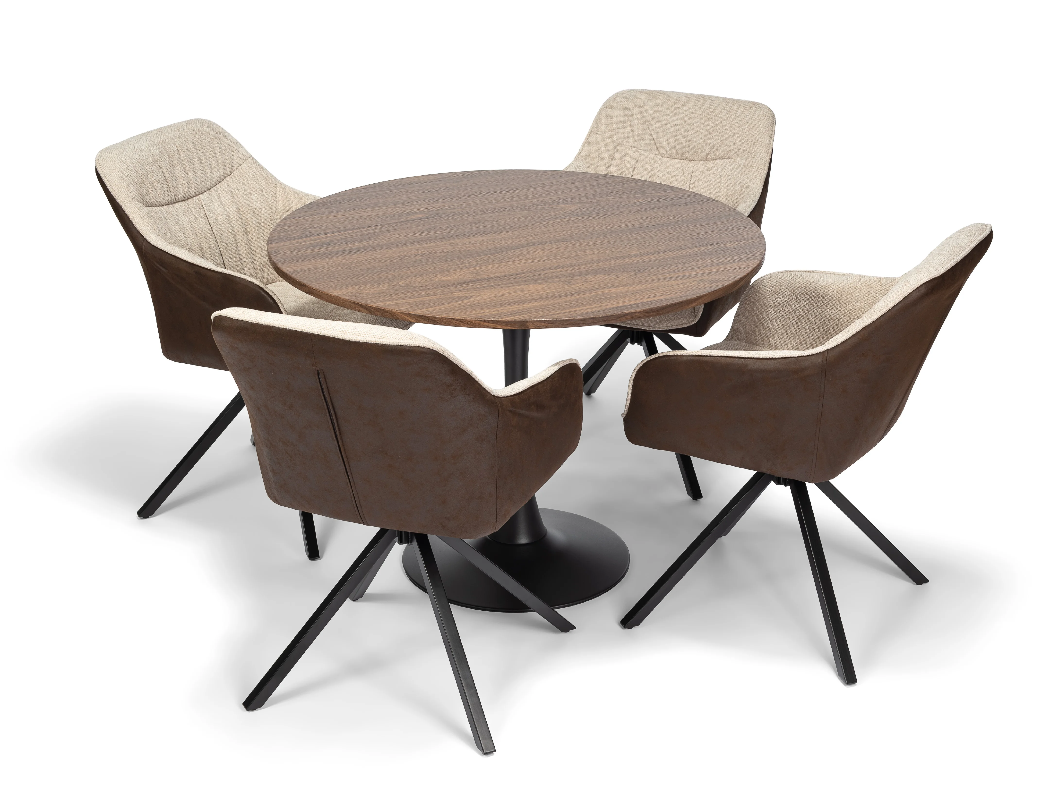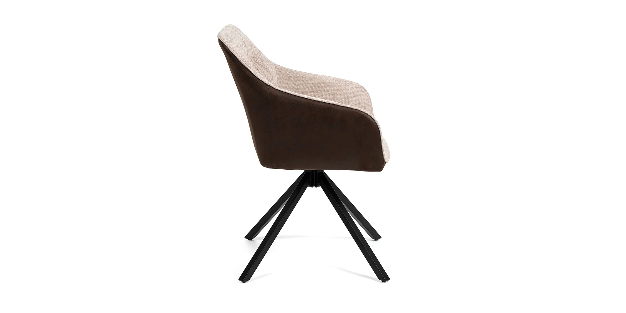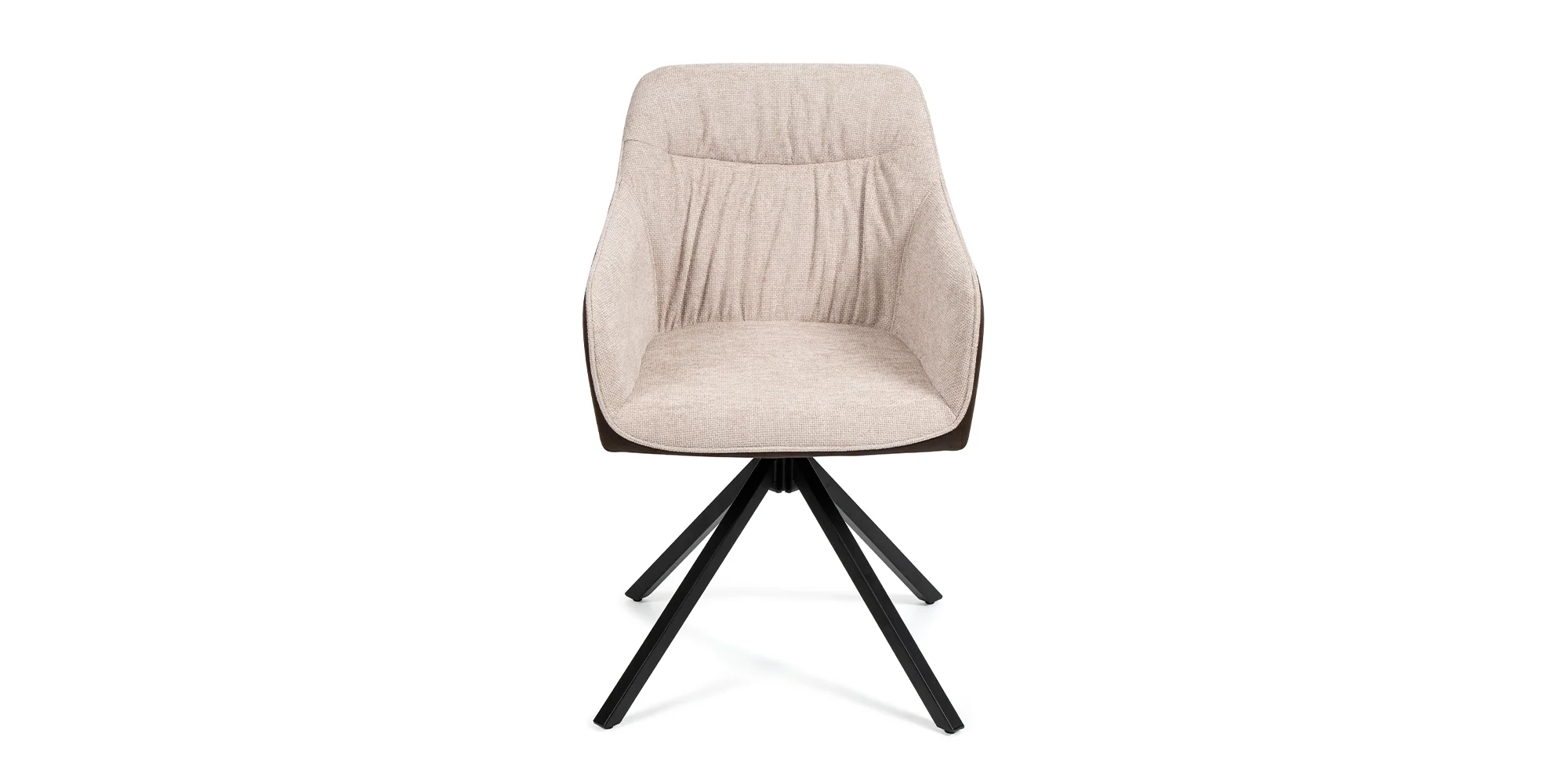 Židle kombinují jemnou textilii v béžovém odstínu s vnější stranou v teplém hnědém dekoru, což vytváří sofistikovaný kontrast. Ergonomicky tvarované opěradlo a měkké čalounění zajišťují komfort, který oceníte při každém posezení – ať už jde o rychlou snídani nebo dlouhou večeři s přáteli.