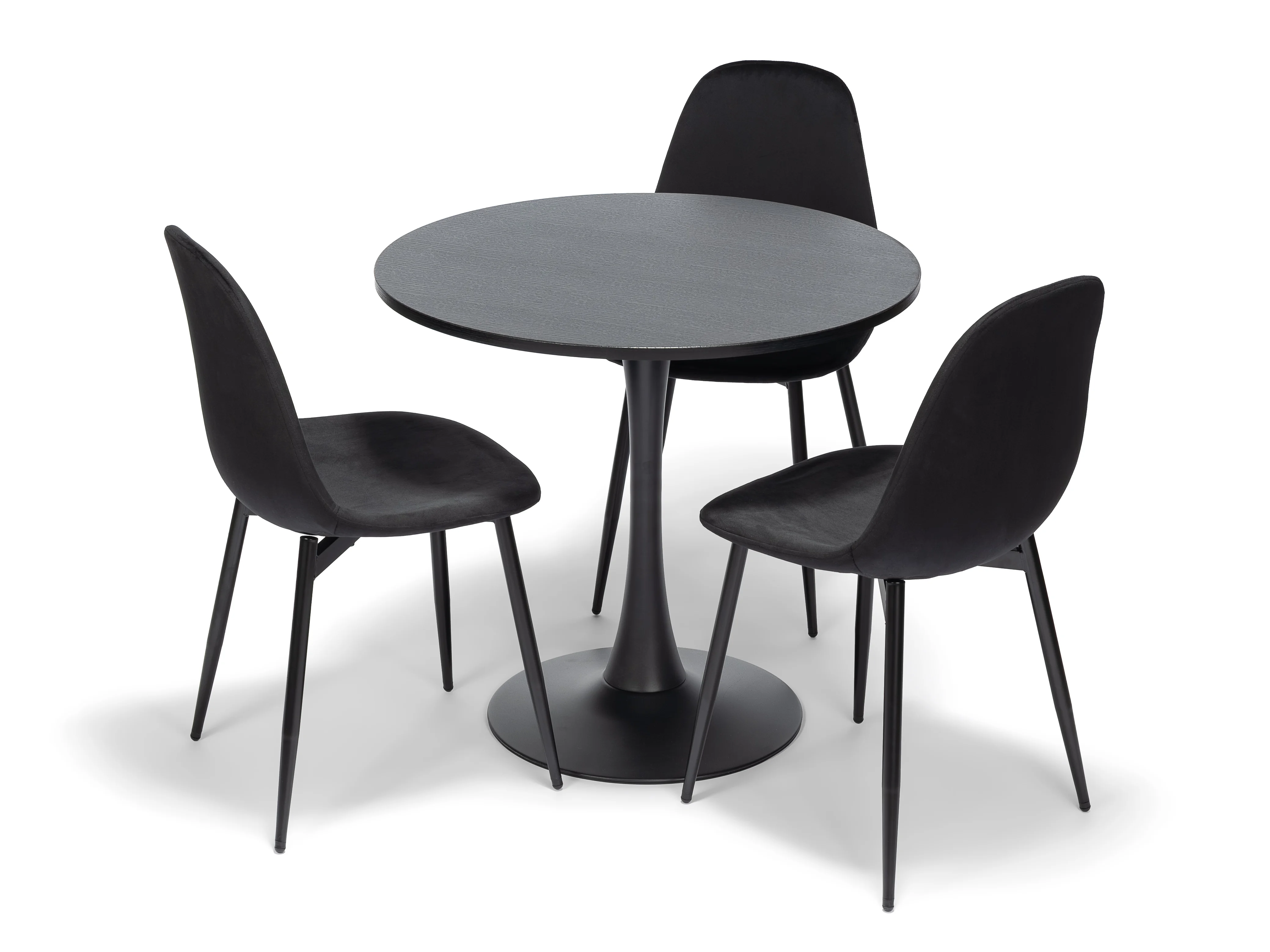 Tento moderní jídelní set v minimalistickém černém provedení je ideální volbou pro současné domácnosti, které hledají kombinaci stylu, praktičnosti a pohodlí. Kulatý stůl s elegantní centrální podnoží působí lehce a zároveň stabilně, což oceníte zejména v menších prostorách nebo otevřených dispozicích propojených s kuchyní.