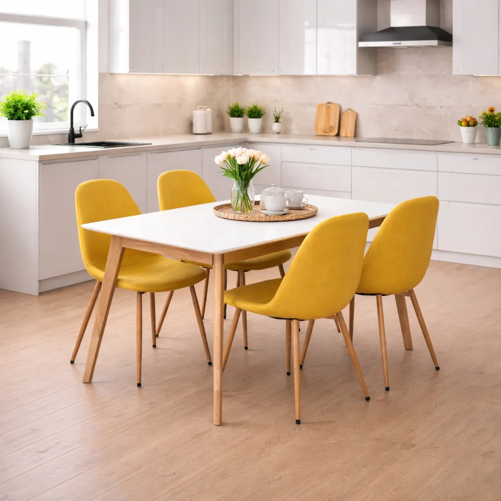 Tento jídelní set je ideální volbou pro moderní kuchyně a jídelny, kde chcete propojit funkčnost s designem. Skvěle se hodí do světlých interiérů, kde vynikne jeho barevnost i jednoduché linie.