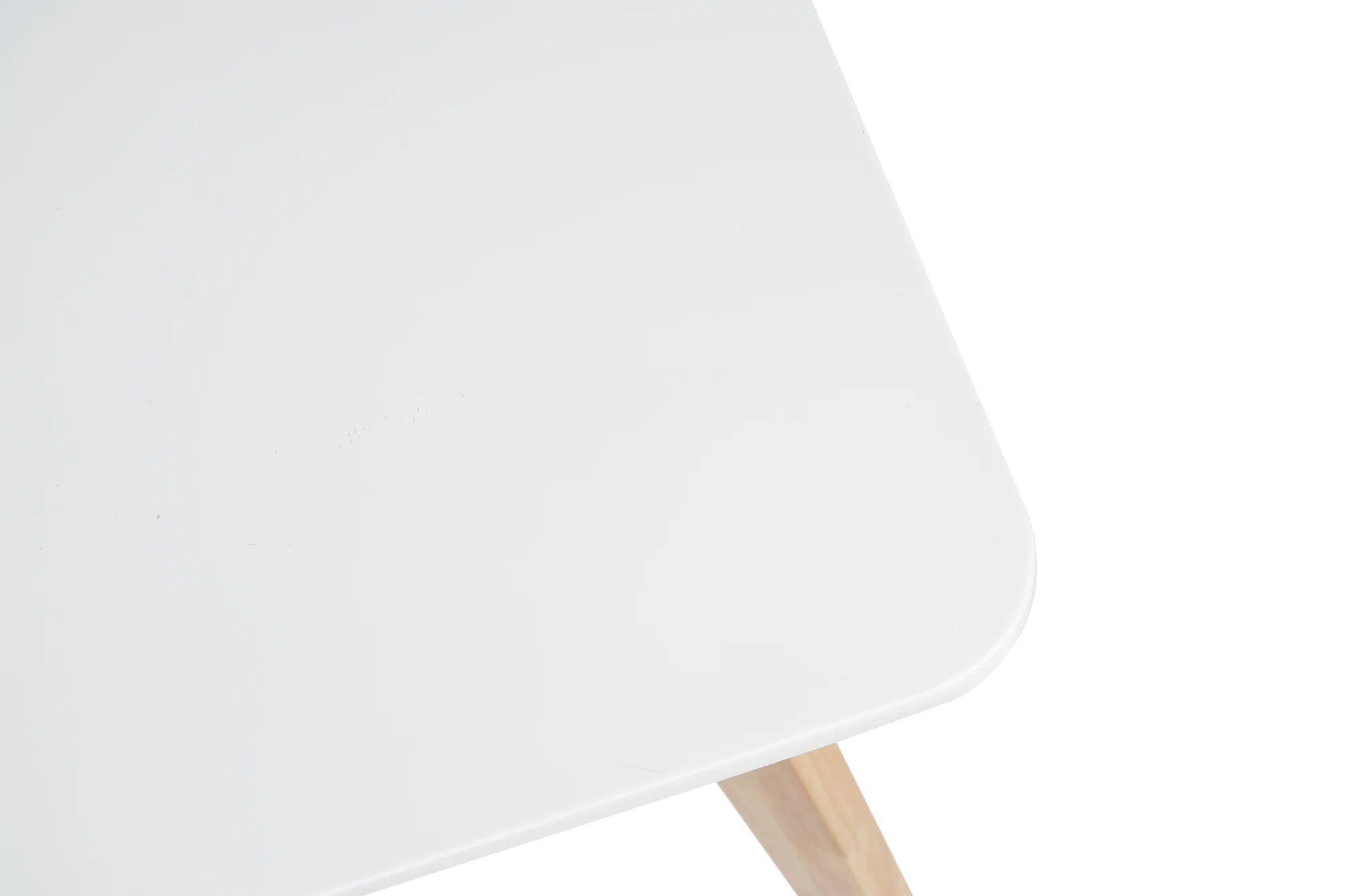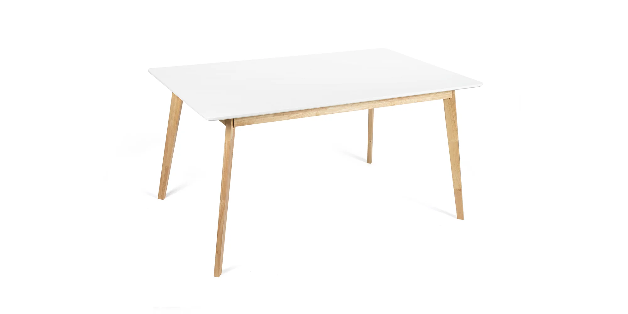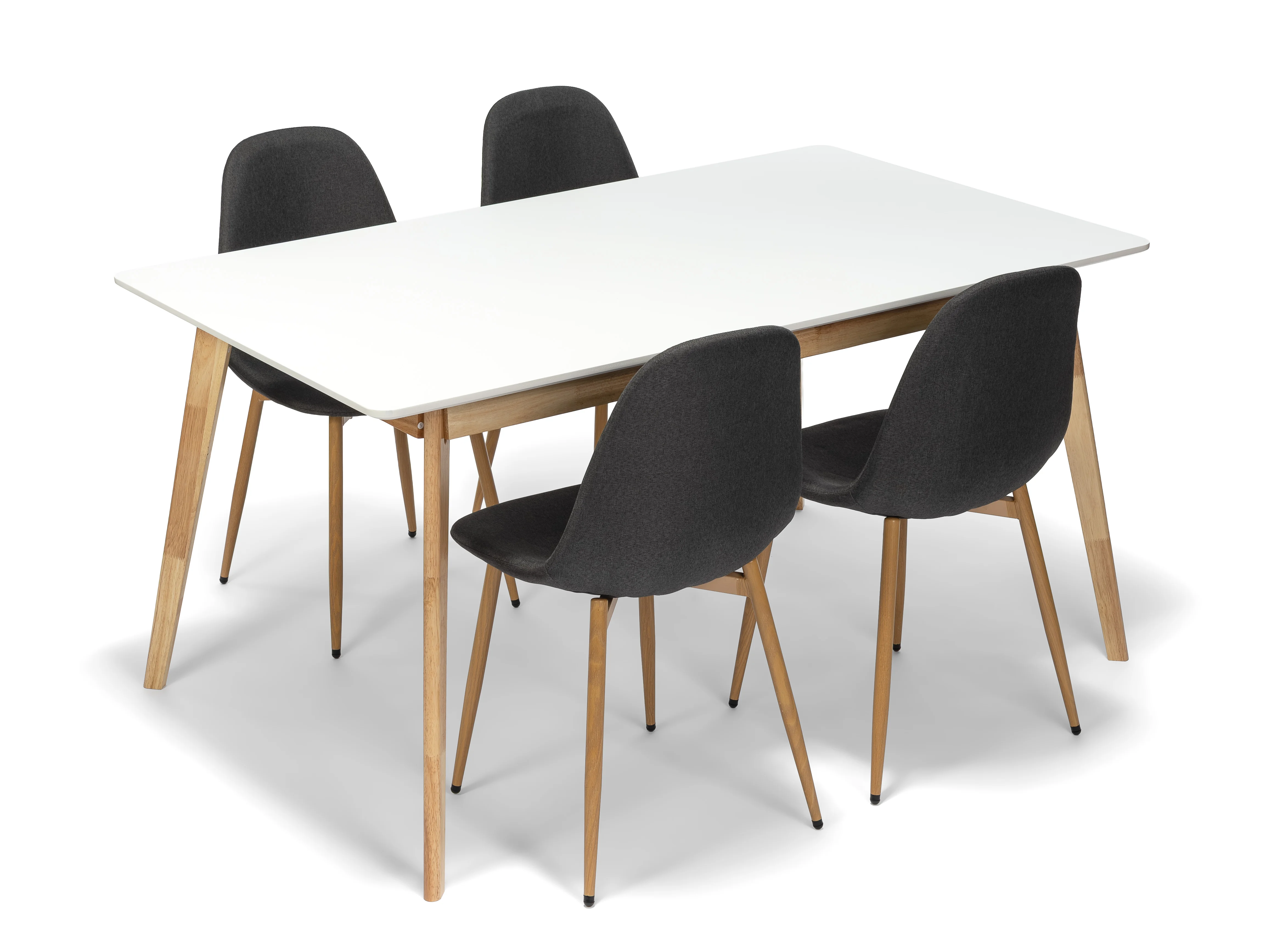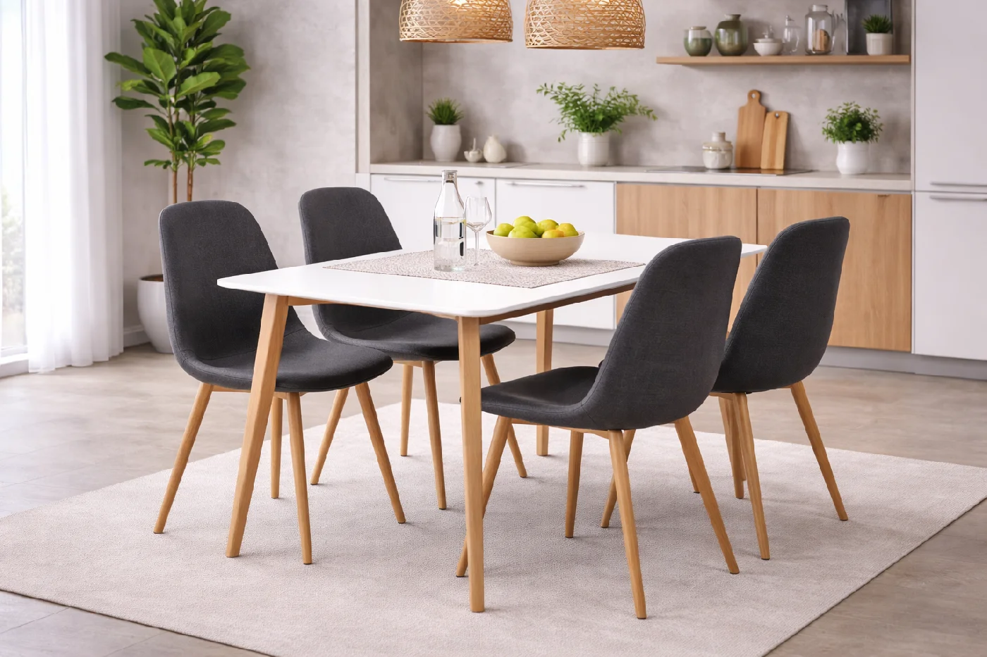 Minimalistická bílá deska opticky odlehčuje prostor a krásně kontrastuje s přírodními dřevěnými nohami, které dodávají interiéru teplo a přirozenost. Židle s jemným šedým čalouněním působí moderně, ale zároveň útulně – jsou navržené tak, aby nabídly pohodlí při každém sezení, ať už jde o rychlou snídani nebo dlouhou večeři s přáteli.