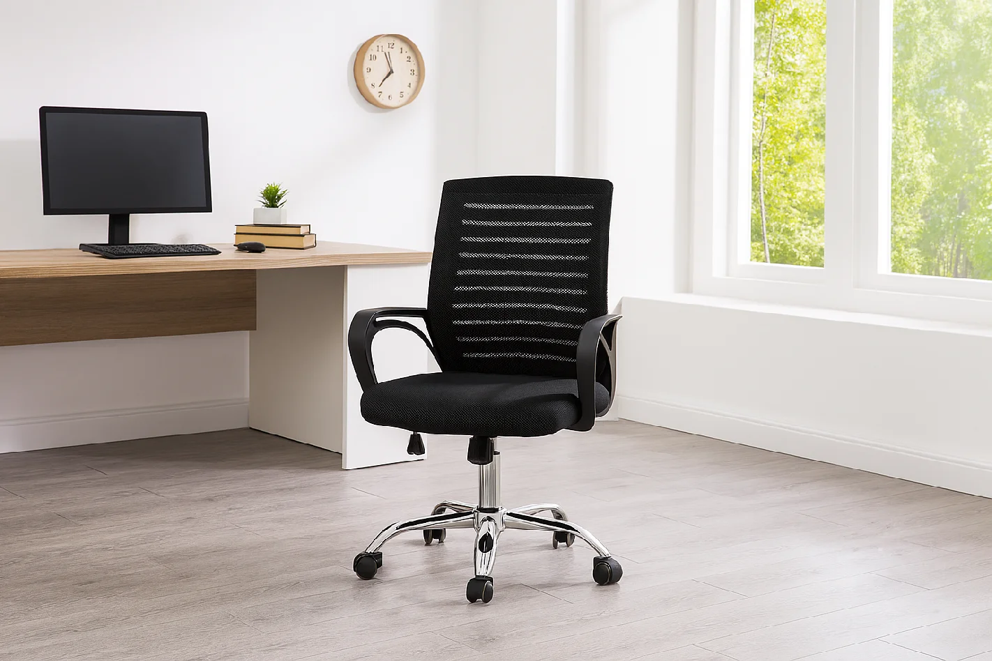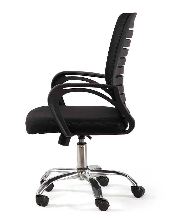 Díky prodyšnému síťovanému opěradlu zůstává sezení příjemné i během delší práce u počítače.