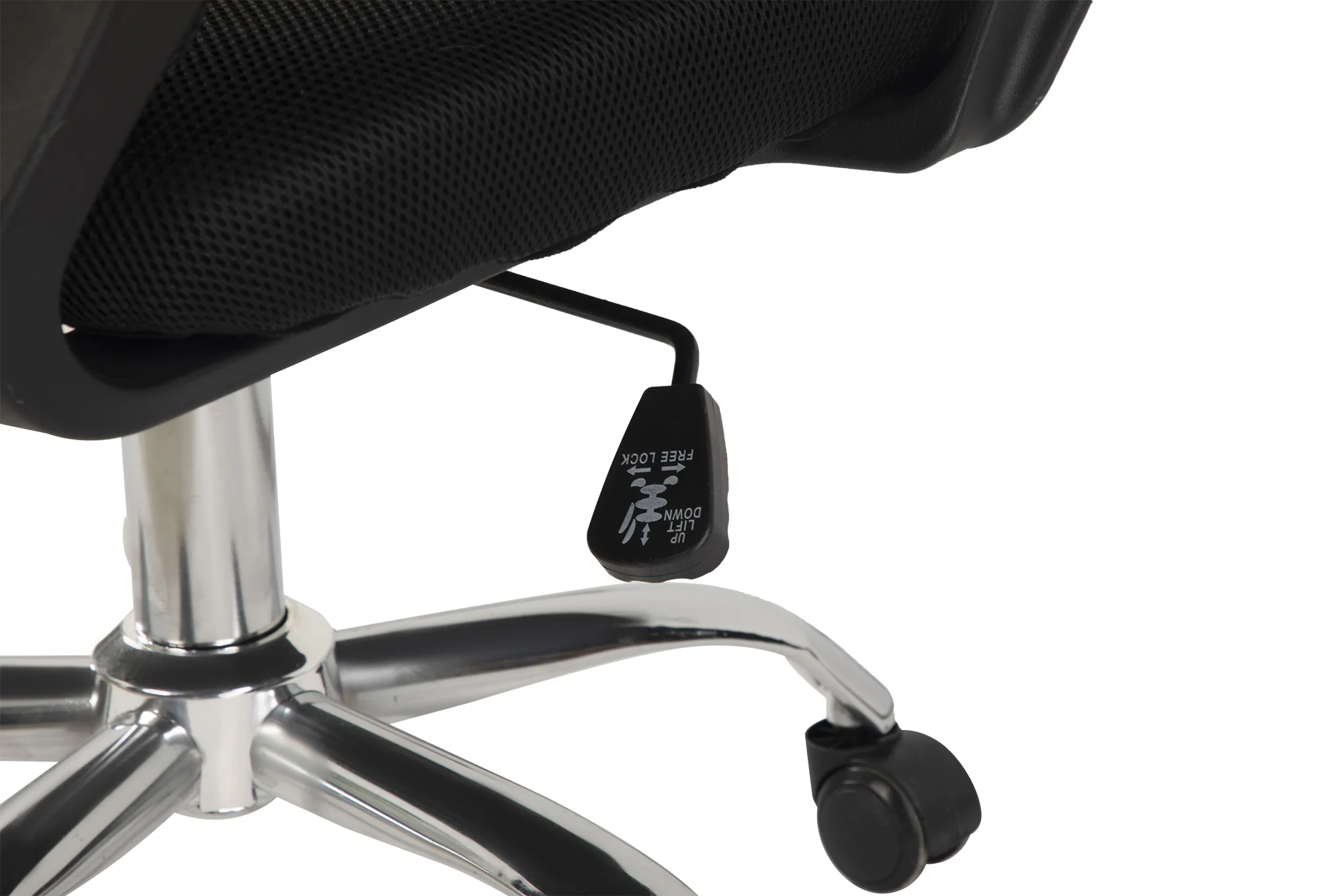 Židle je vybavena plynovým pístem pro nastavení výšky sedu, houpacím mechanismem a stabilní chromovou základnou s kolečky pro snadný pohyb po místnosti.