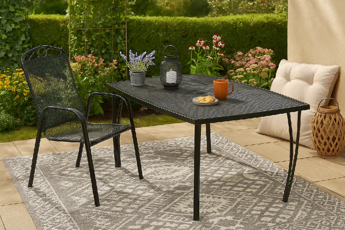 Područky přidávají na pohodlí při každodenním sezení a lehce zdobné opěradlo dodává židli jemný dekorativní detail, aniž by působila přehnaně. Černý design je nadčasový a dobře se kombinuje s různými typy zahradních stolů i dalšího venkovního nábytku.
