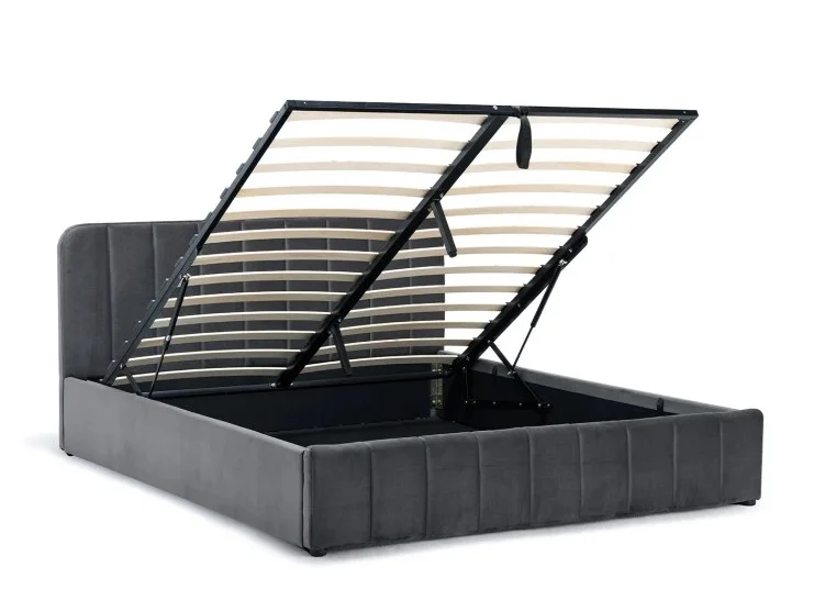 Posteľ AVENA 160 tmavo sivá je moderná čalúnená posteľ s úložným priestorom, výklopným lamelovým roštom na hydraulike, zamatovým poťahom a nosnosťou do 250 kg, ideálna pre páry a všetkých, ktorí chcú elegantnú, praktickú a nadčasovú spálňu.
