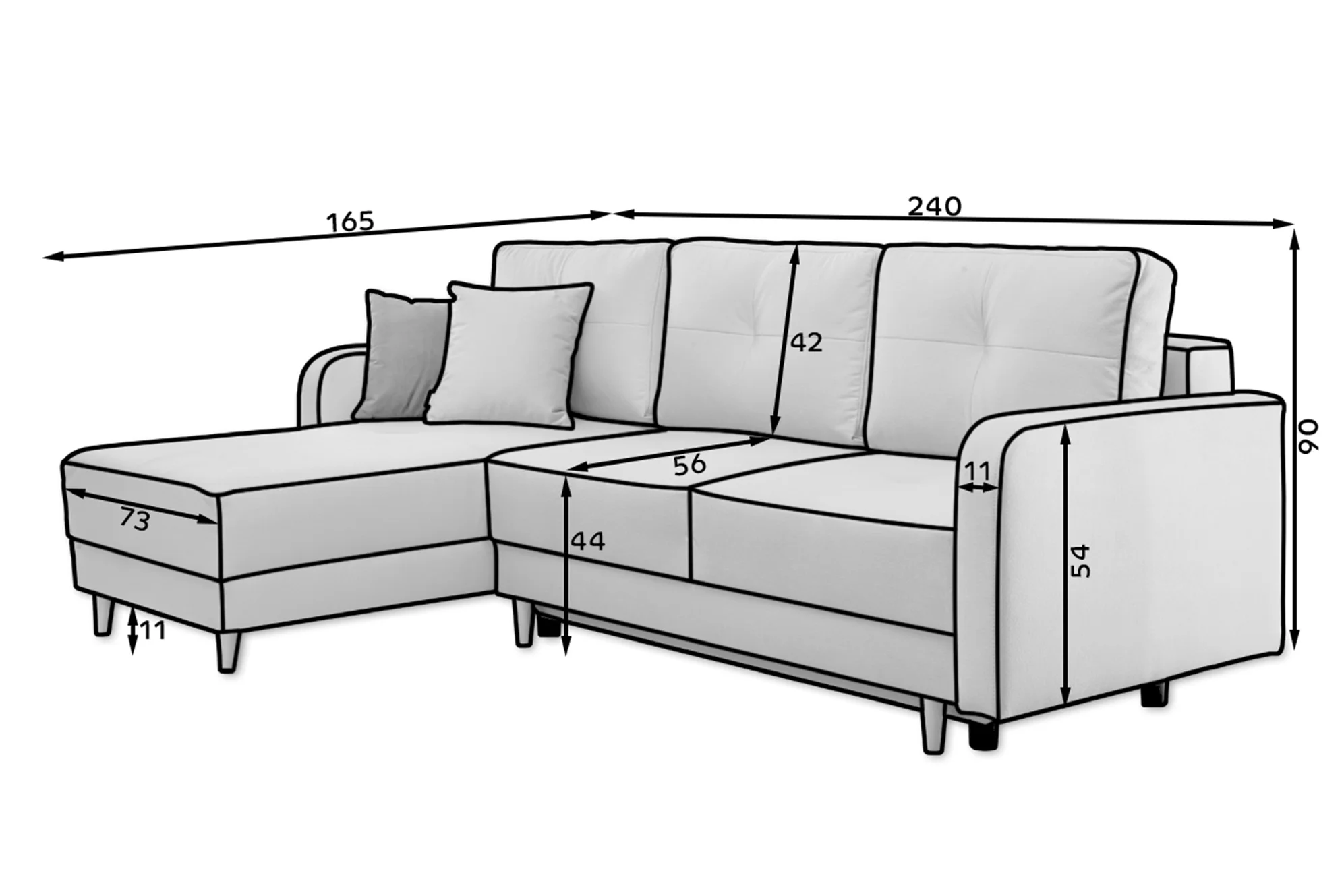 S rozmermi 240 × 165 × 90 cm je ROXANA ideálna do stredne veľkých priestorov. Elegantný a moderný dizajn v sebe skrýva komfort a praktickosť. Sedák je tvorený kombináciou vysoko elastickej HR peny a odolnej T30 peny, spolu s vlnovou pružinou typu B, čo zabezpečuje dlhú životnosť a pohodlie. Operadlo je z univerzálnej T25 peny, nohy sú vyrobené zo svetlého jelšového dreva, ktoré je nielen praktické z hľadiska údržby, ale zároveň dodáva nábytku prirodzený šarm – ideálne do škandinávskeho štýlu.