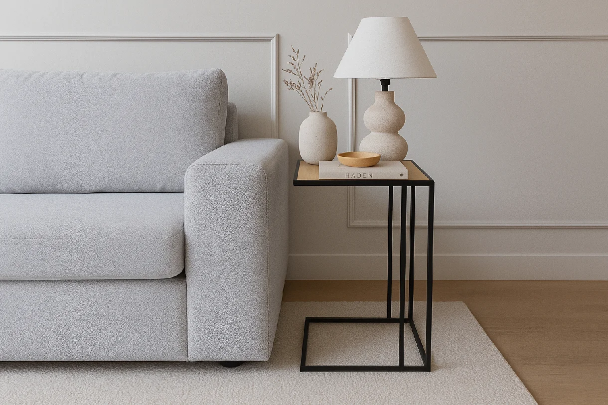 Konferenční stolek s minimalistickým designem. Stolová deska v dekoru přírodního dřeva dodává teplý vzhled. Stabilní kovová konstrukce v černém provedení. Praktický tvar umožňuje snadné zasunutí k sedačce či křeslu. Kombinace jednoduchosti, funkčnosti a elegantního stylu