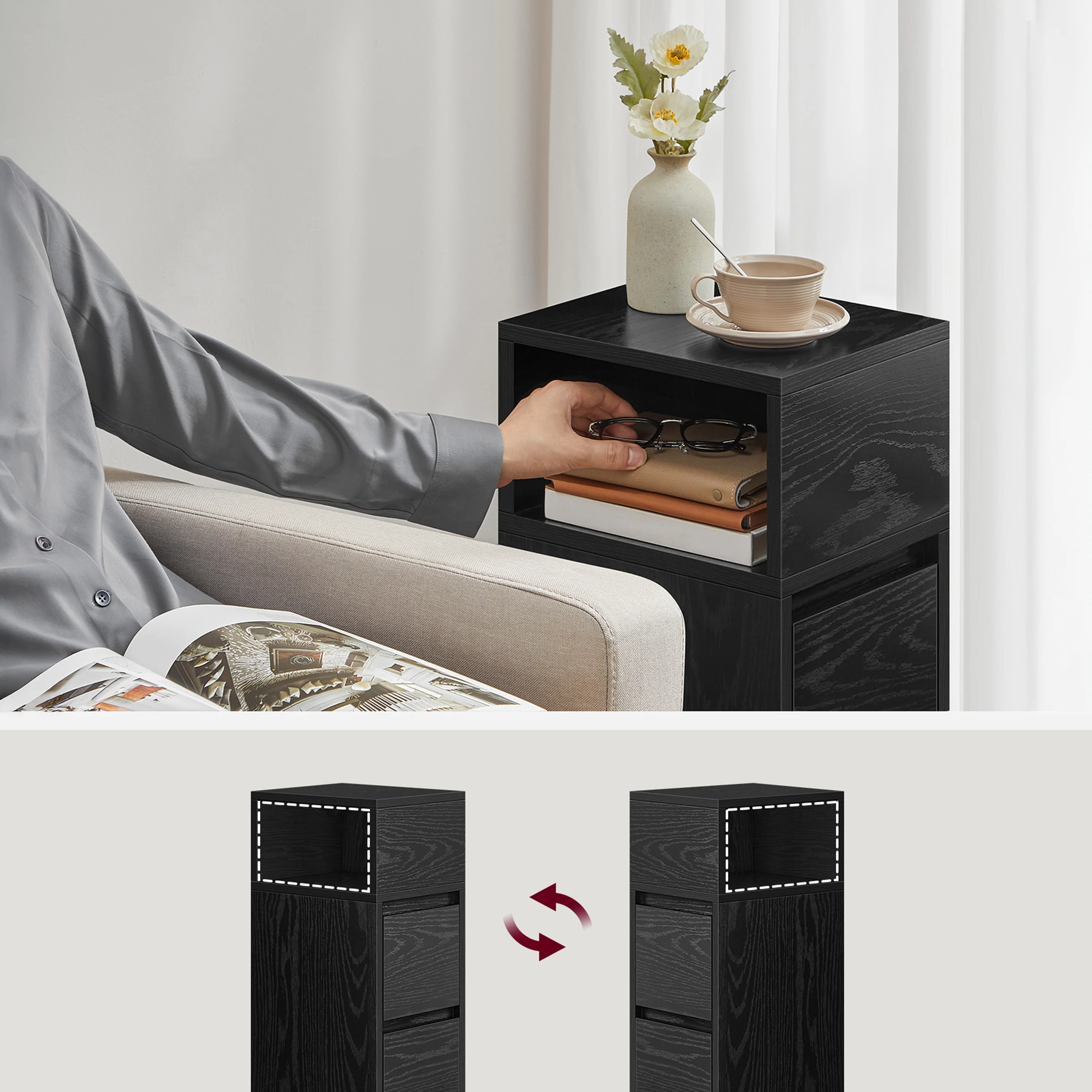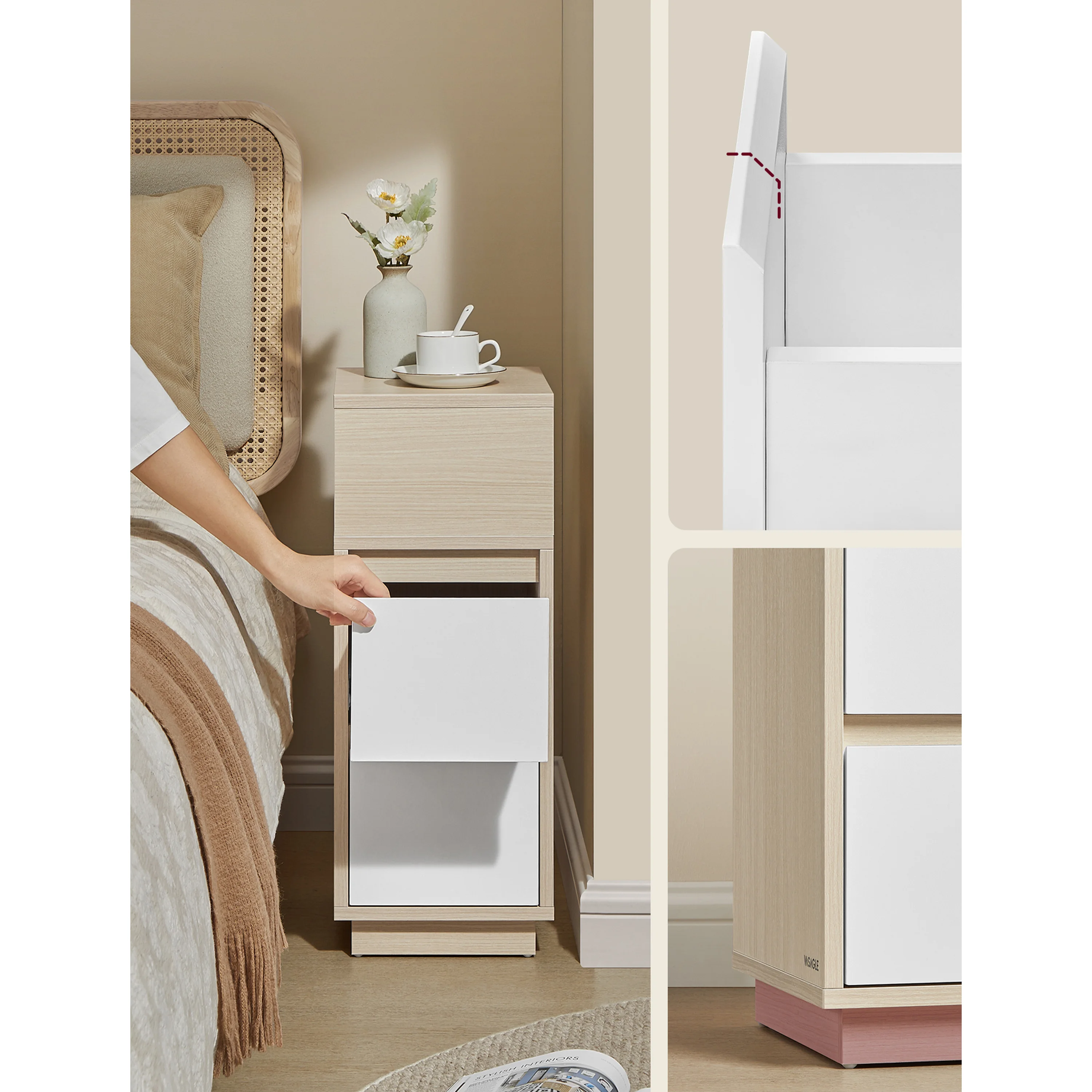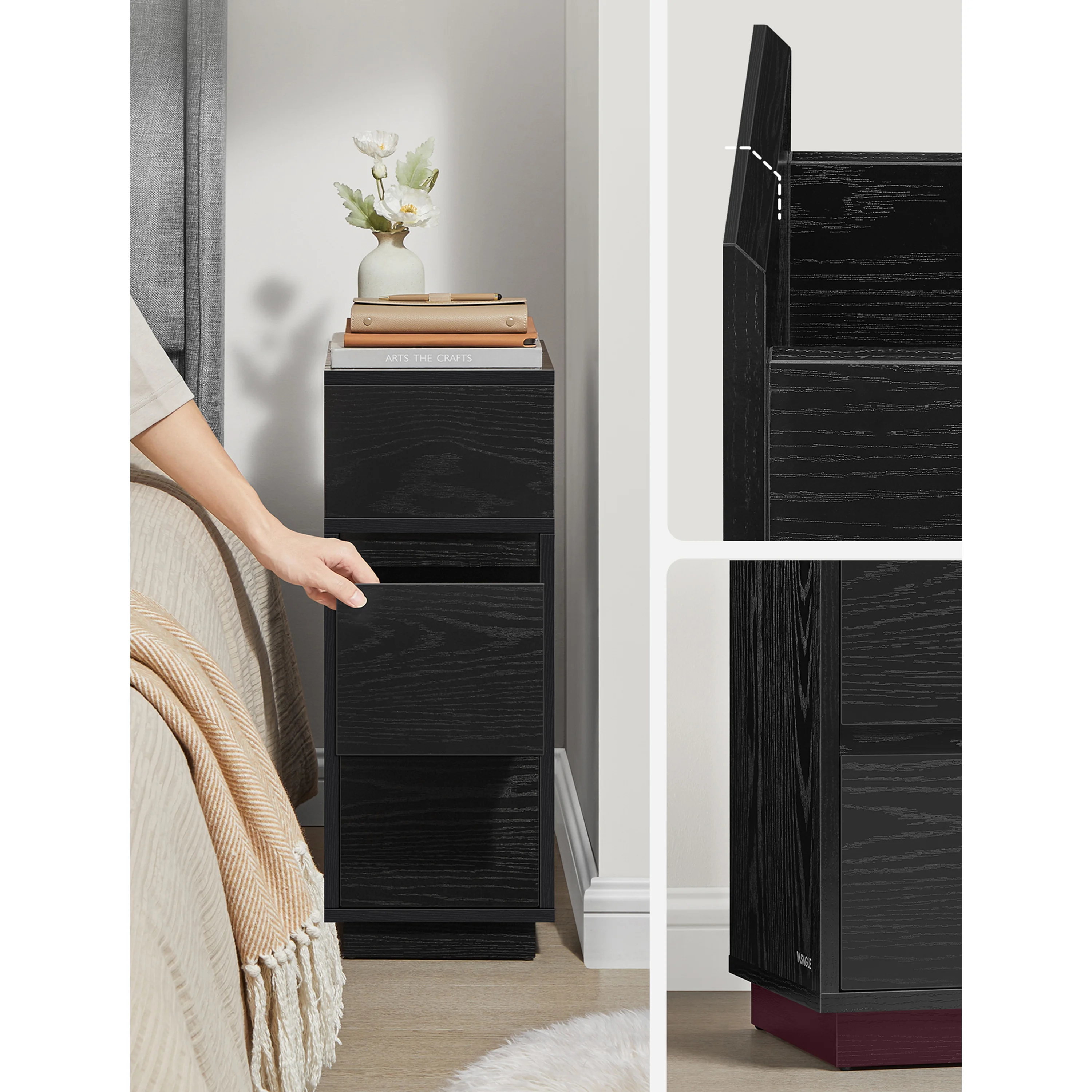 Maximálne využitie minimálneho priestoru - Máte vedľa postele alebo gauča len úzku medzeru a neviete, ako ju využiť? Nočny stolík je navrhnutý presne pre tieto situácie. Vďaka svojmu štíhlemu profilu sa zmestí tam, kam sa bežné nočné stolíky nezmestia, a premení „hluché miesto“ na užitočný úložný priestor.