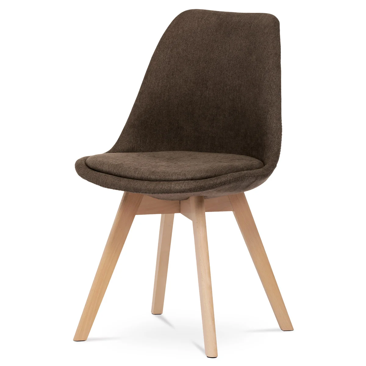 Jídelní židle s tvarovaným čalouněným korpusem v hnědé barvě, vybavená pohodlným polstrovaným sedákem, který ladí s opěrkou. Nohy jsou vyrobeny z bukového masivu v přírodním odstínu, dodávající židli stabilitu a estetický kontrast. Židle je navržena s ohledem na pohodlí i styl, což ji činí ideální volbou pro moderní interiéry. Plastové kluzáky na nohách zajišťují ochranu podlahové krytiny před poškozením. Díky svému elegantnímu skandinávskému designu je vhodná do kuchyní, pracoven i obývacích pokojů.